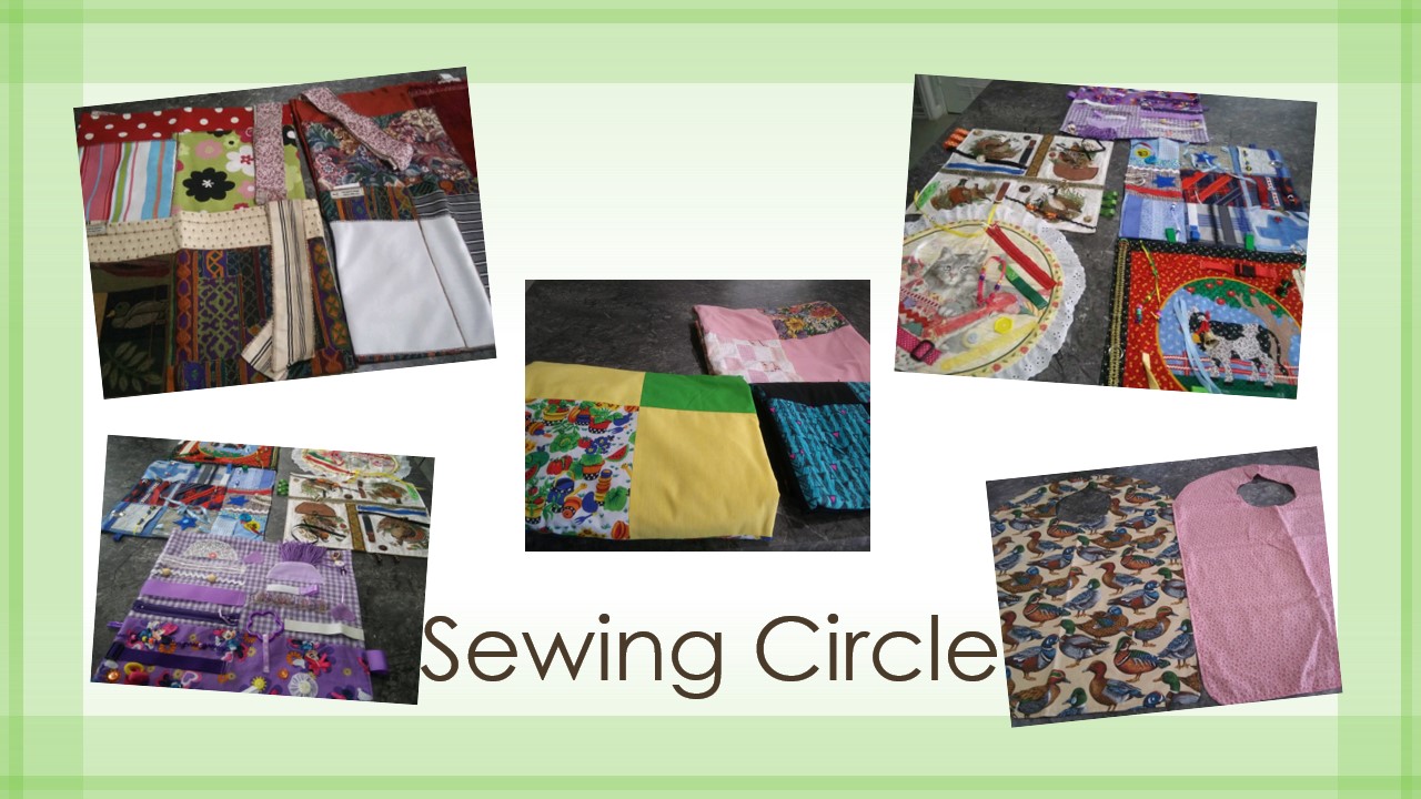 The sewing circle was started to help meet a community need for items for our elderly. Busy quilts to help occupy time, bibs for the dining room, lap blankets, and wheel chair and walker bags to help carry items are some of the things they make. As of this time, they have donated literally hundreds of needed items.